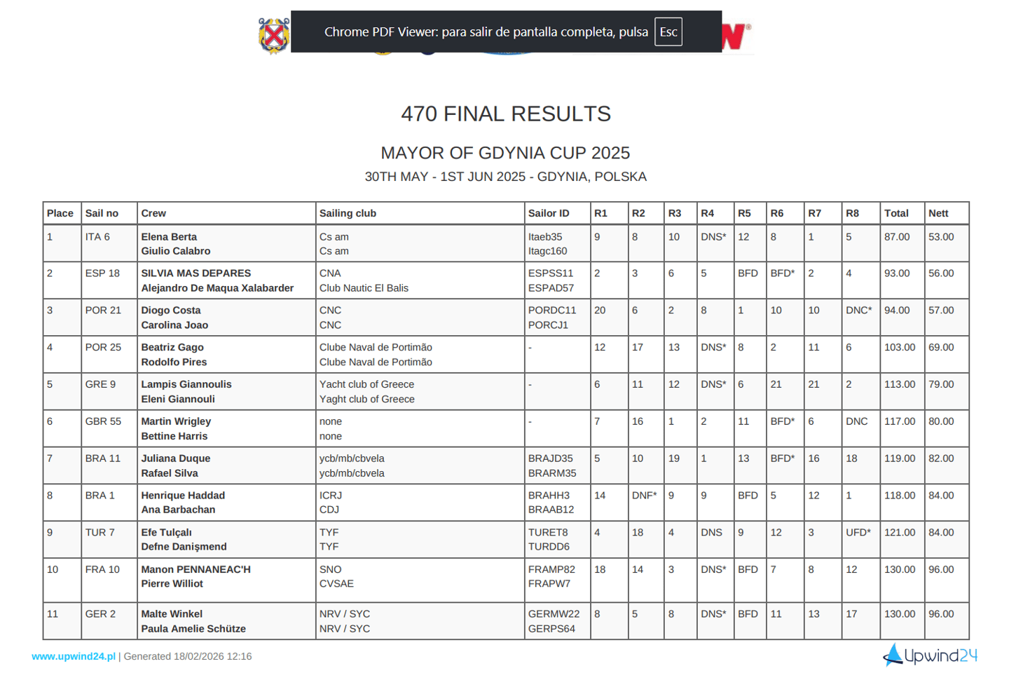La Mayor of Gdynia Cup 2025 fue la regata de preparación oficial celebrada 5 días justo antes del Campeonato del Mundo en Gdynia, Polonia (6-14 de junio).