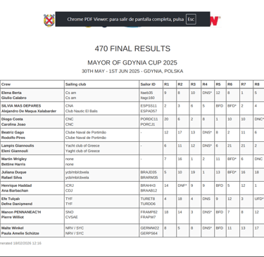 Post: "Termina la MAYOR OF GDYNIA CUP de 470, regata de preparación para el Mundial de la clase que empieza en 5 días. Destacar los resultados de Silvia Mas junto a Alejandro De Maqua (CN El Balis) que han finalizado 🥈segundos. La tripulación de Marta Cardona junto a Jordi Xammar (RCNB) han terminado 21 sin finalizar todas las pruebas."470 Olympic Sailing (Facebook oficial de la clase):